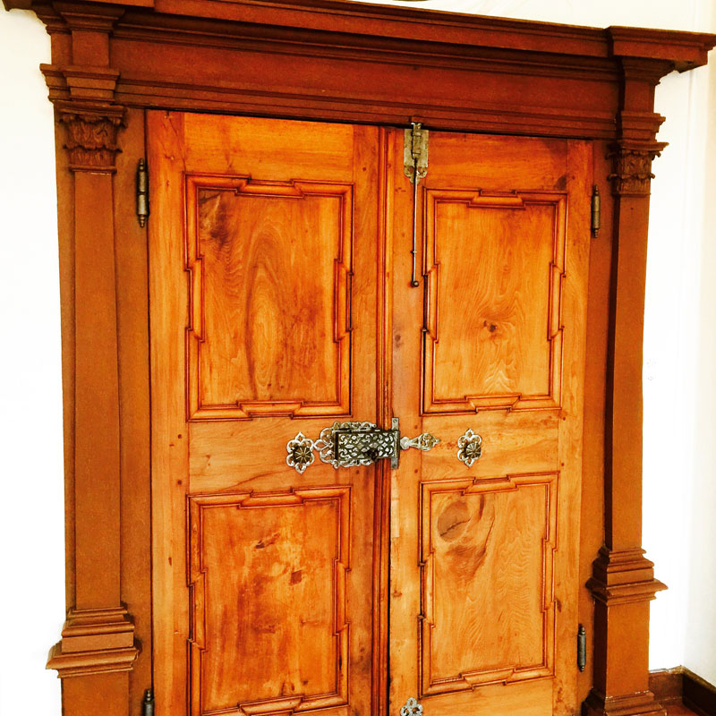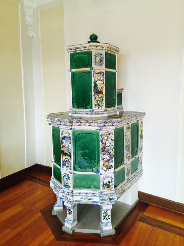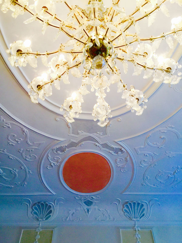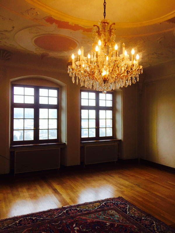 Das Antikzimmer misst 55 m2. Dieser schmucke Raum besticht durch antike Stuckaturen, einem Ofen aus dem 15. Jahrhundert und einem grossen Kristallleuchter.