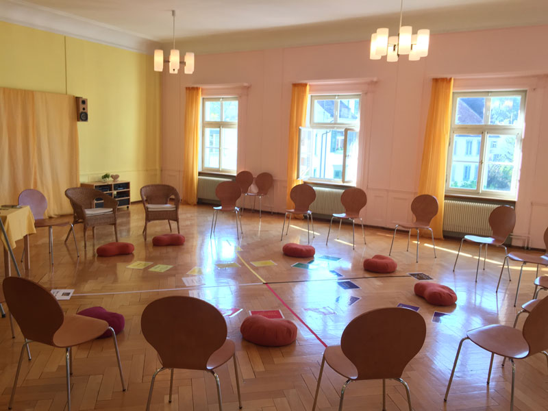 Unser grösster Versanstaltungsraum misst 110 m2 und ist säulenfrei mit einem schönen Parketboden und hoher Decke. Lichtvoll und geräumig. Geeignet für Körperarbeiten, Seminare, Vorträge, Meetings, usw.
